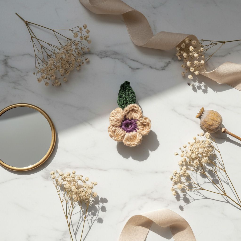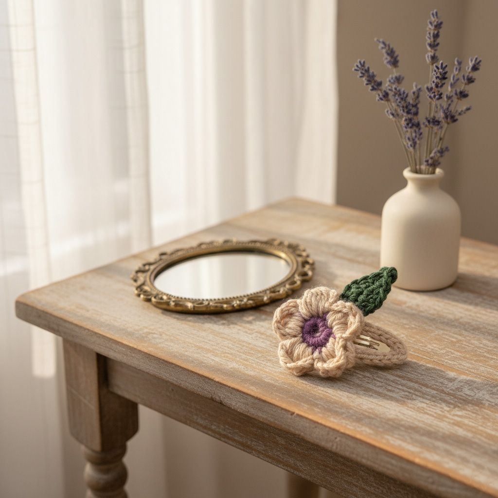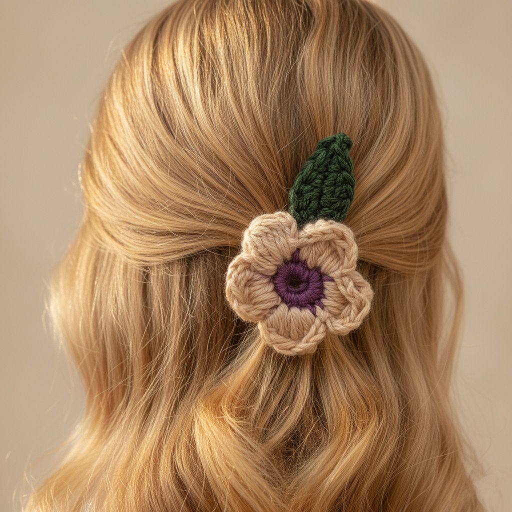 Clip de pelo con flor beige tejida a mano en algodón y bambú. 6cm de diámetro, cinco pétalos con centro morado. Incluye una hoja verde y pinza de acero inoxidable. Un accesorio artesanal elegante y natural para dar estilo a tus peinados.