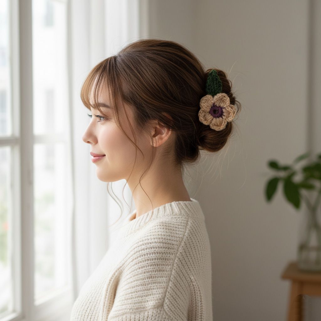 Dale un toque elegante y natural a tu look con este precioso clip de pelo tejido a mano, una pieza única que combina la suavidad del beige con el contraste vibrante del morado. Perfecto para añadir distinción a cualquier peinado.